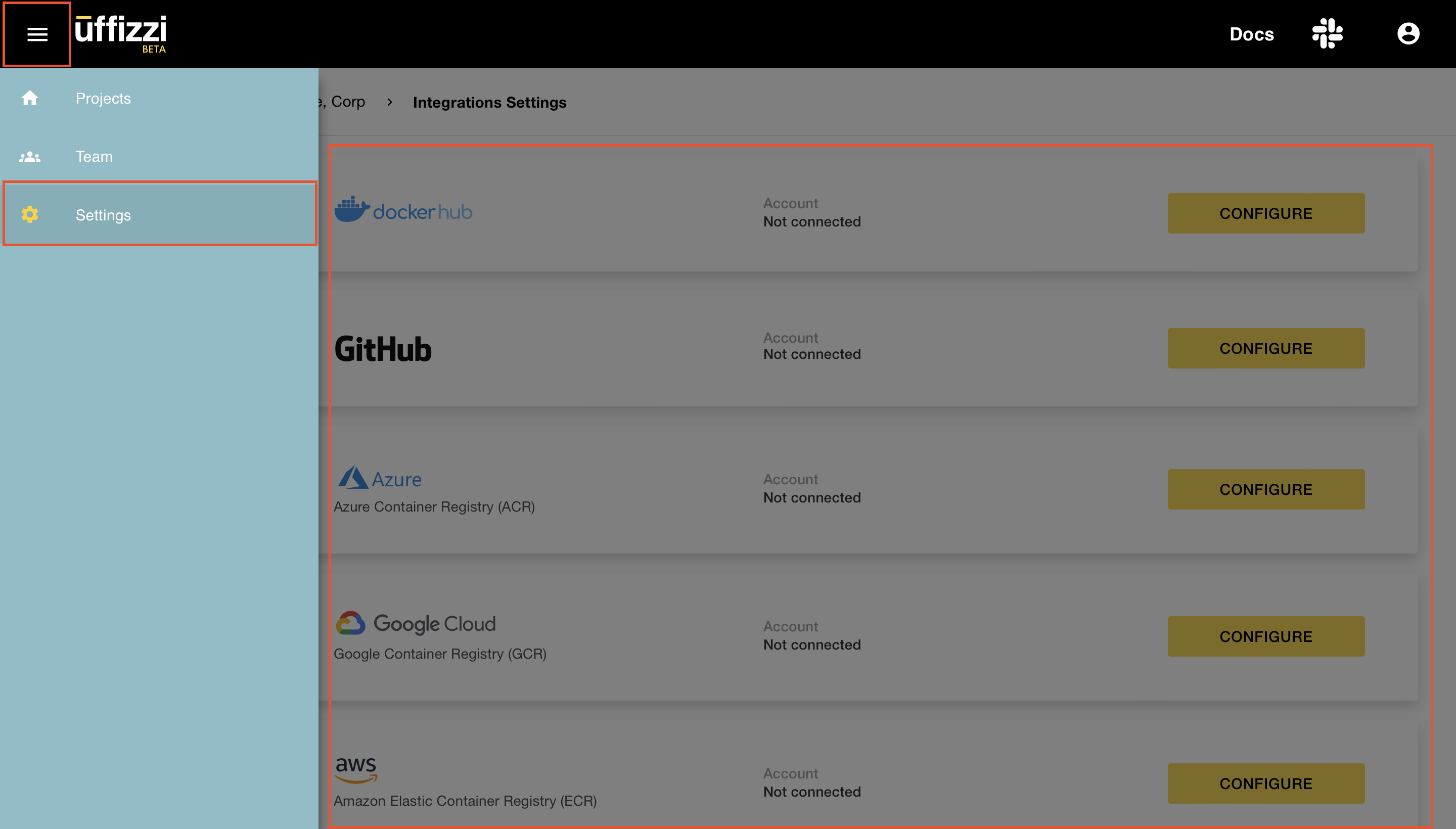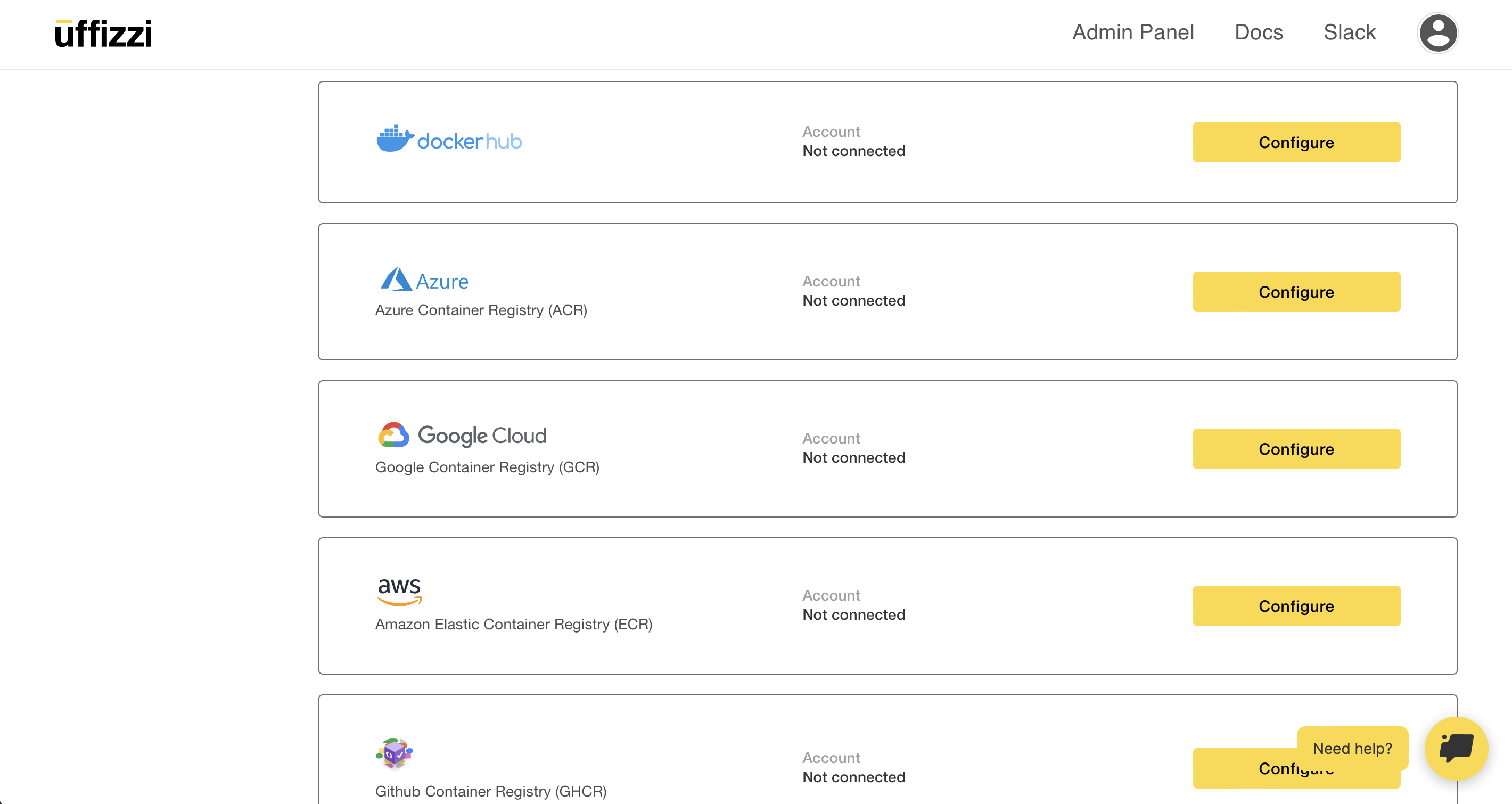 Login to Uffizzi, then navigate to Account > Settings > Registries, then select Configure next to the GHCR option.