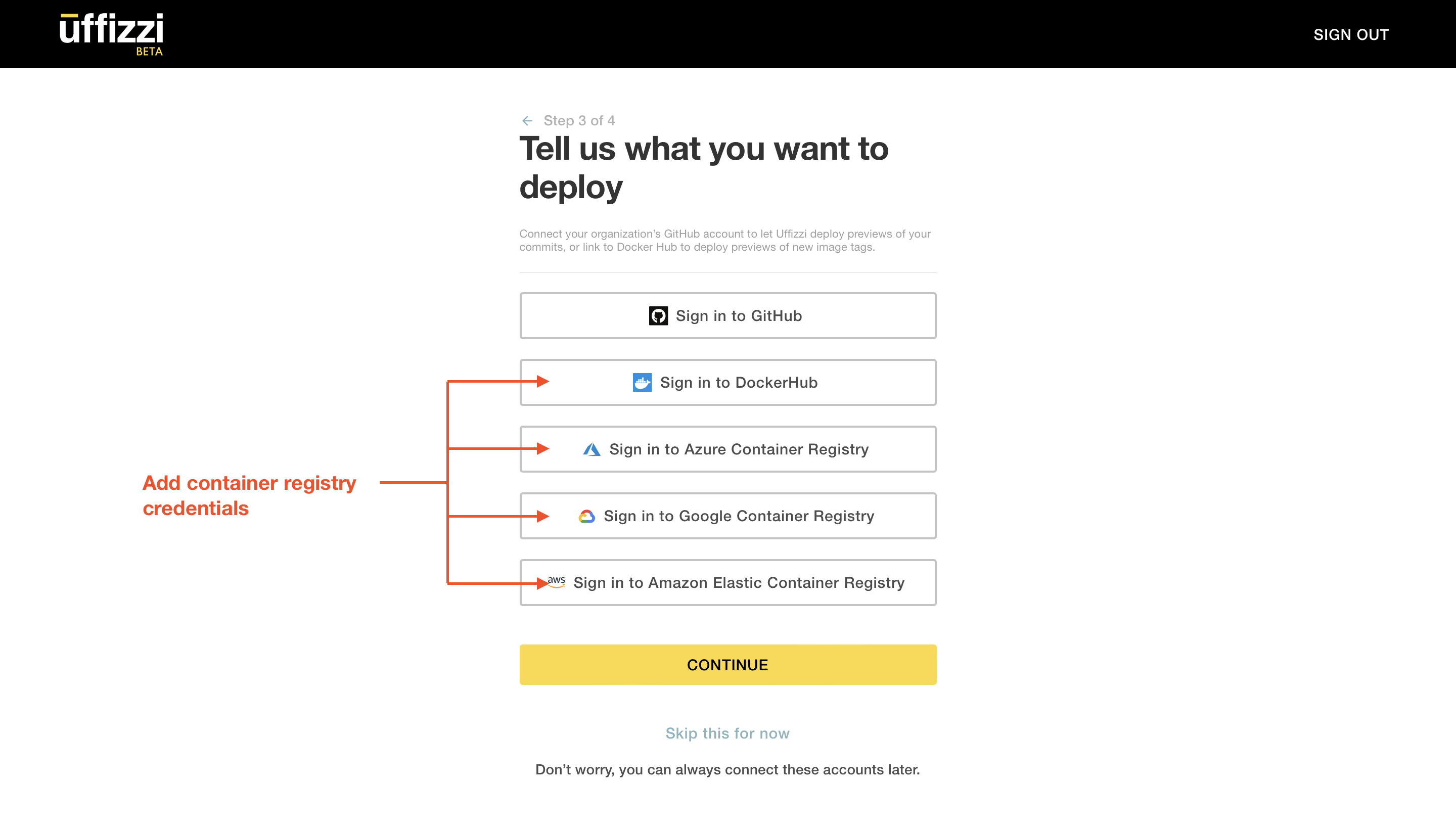 Now, we need to add these same credentials in the Uffizzi Dashboard. In Step 3 of 4 of the account setup guide, you are asked to connect to various external services, as shown below. Select the Sign in option for your registry provider(s) of choice, then enter your credentials. For example, to add AWS_ACCESS_KEY_ID and AWS_SECRET_ACCESS_KEY, select Sign in to Amazon Elastic Container Registry.