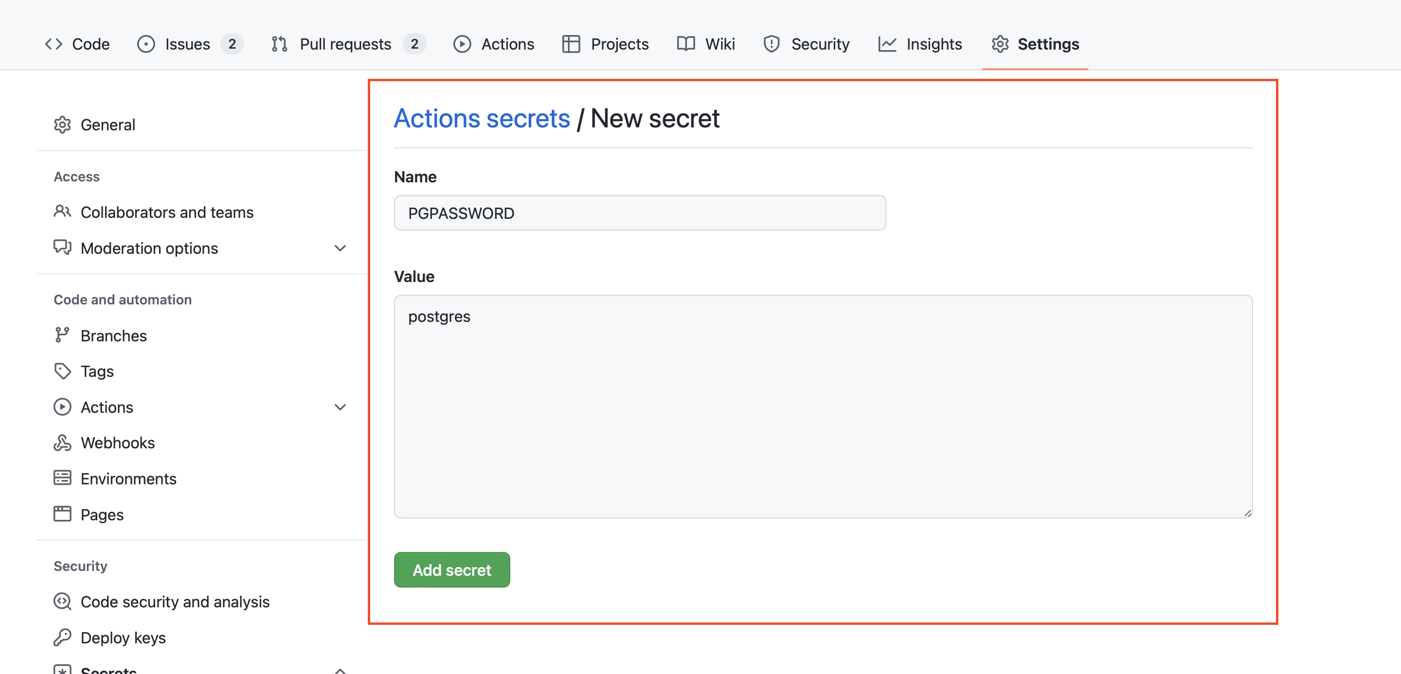 If you use Amazon ECR, Azure Container Registry (ACR), Google Container Registry (GCR), or Docker Hub, you should add your credentials as GitHub repository secrets. In the highlighted example below, AWS_ACCESS_KEY_ID and AWS_SECRET_ACCESS_KEY are used: