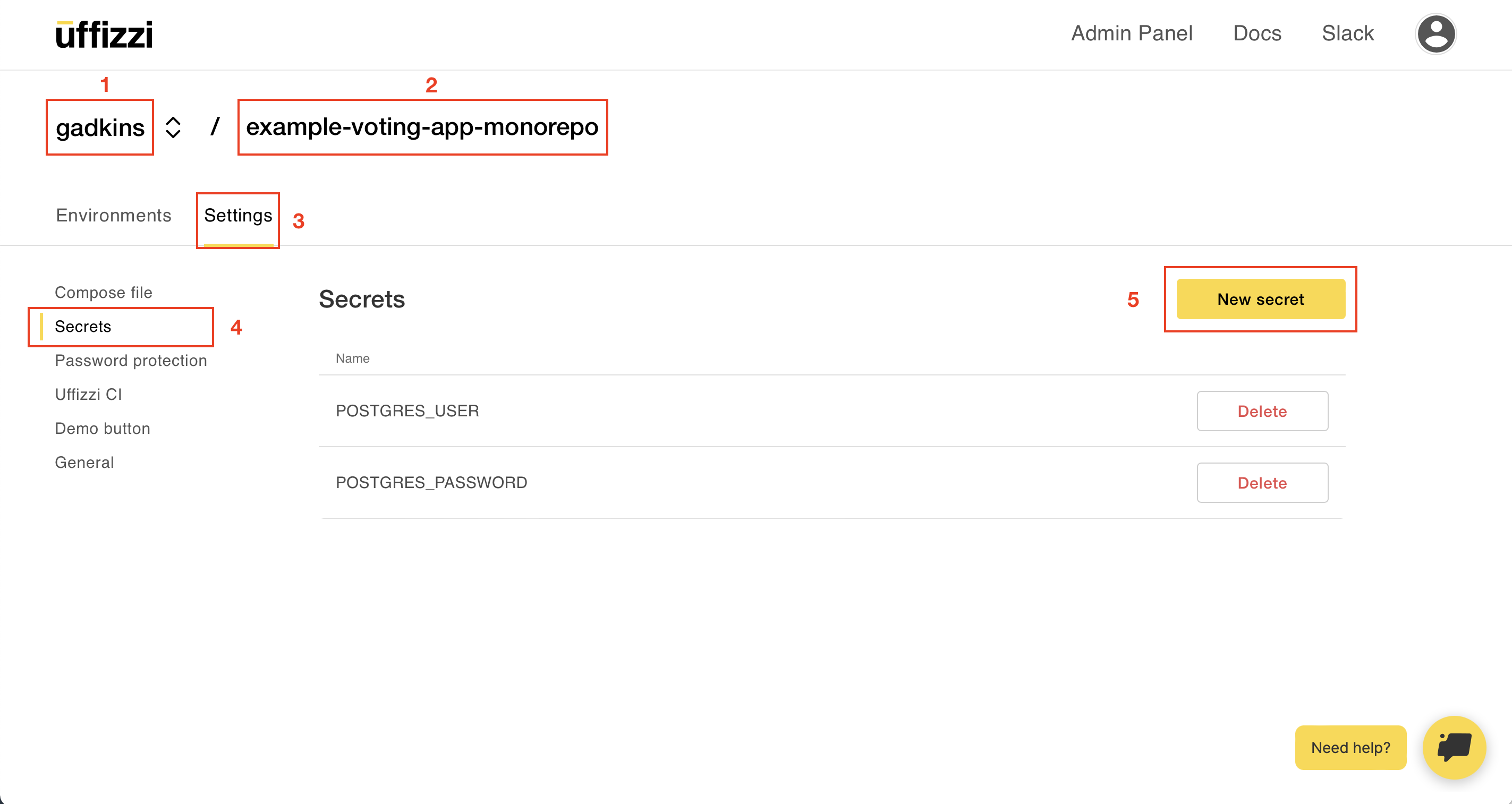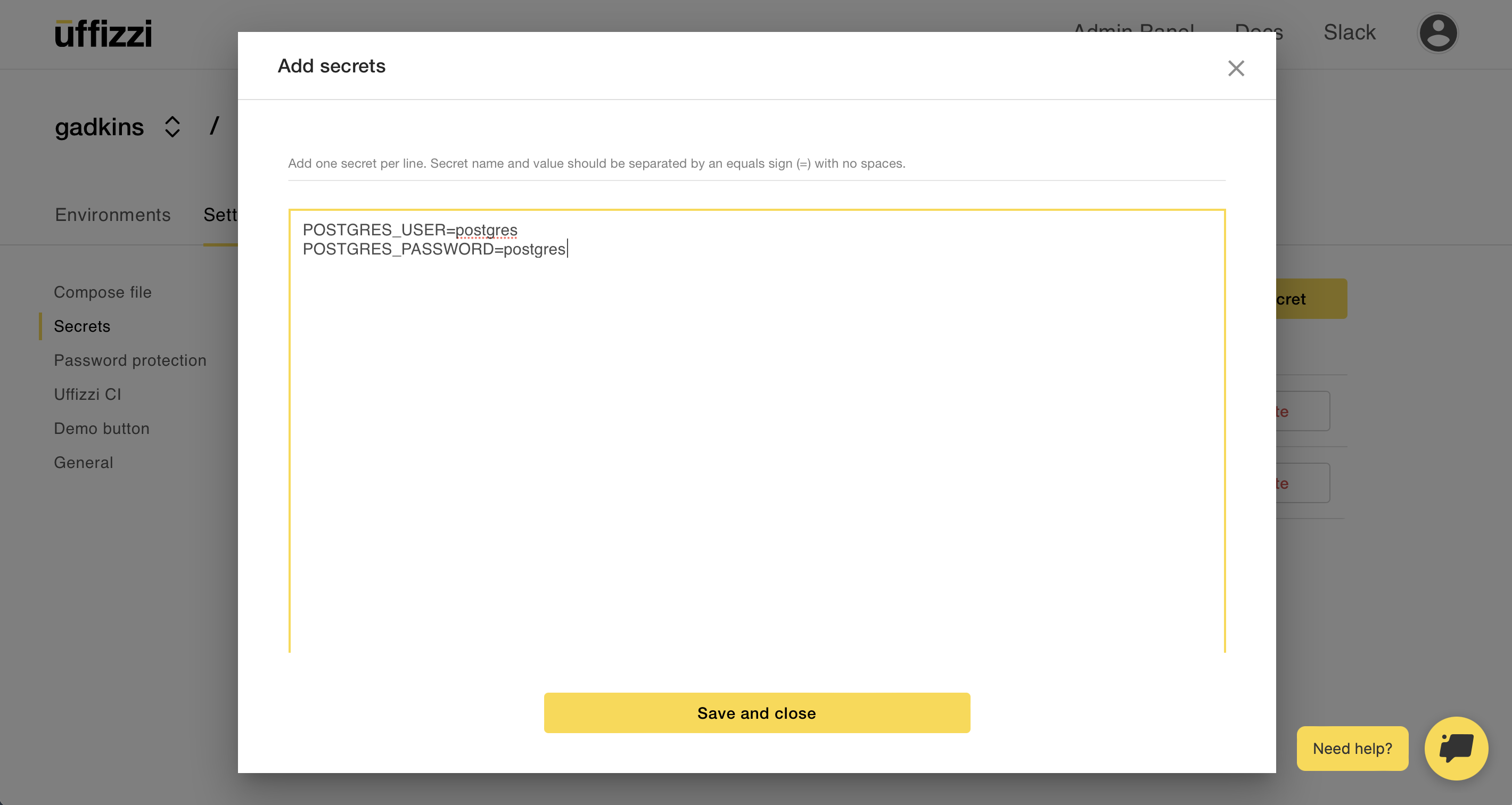 If your compose file includes [application secrets](https://docs.uffizzi.com/references/compose-spec/#secrets), such as database credentials, you can add them in the Uffizzi Dashboard. Navigate to your project, then select Specs > Secrets > NEW SECRET. This will open a modal, where you can input your secrets as NAME=VALUE pairs. Be sure to add one secret per line, separatedy by = with no white spaces.