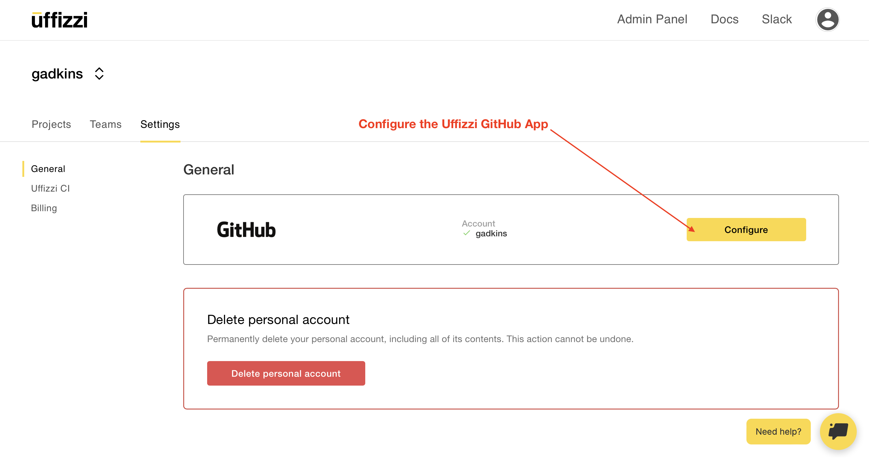 In this step you will install the Uffizzi GitHub App and grant Uffizzi access to the repositories you want to deploy. Login to Uffizzi, then navigate to Account > Settings > General, then select Configure next to the GitHub option.