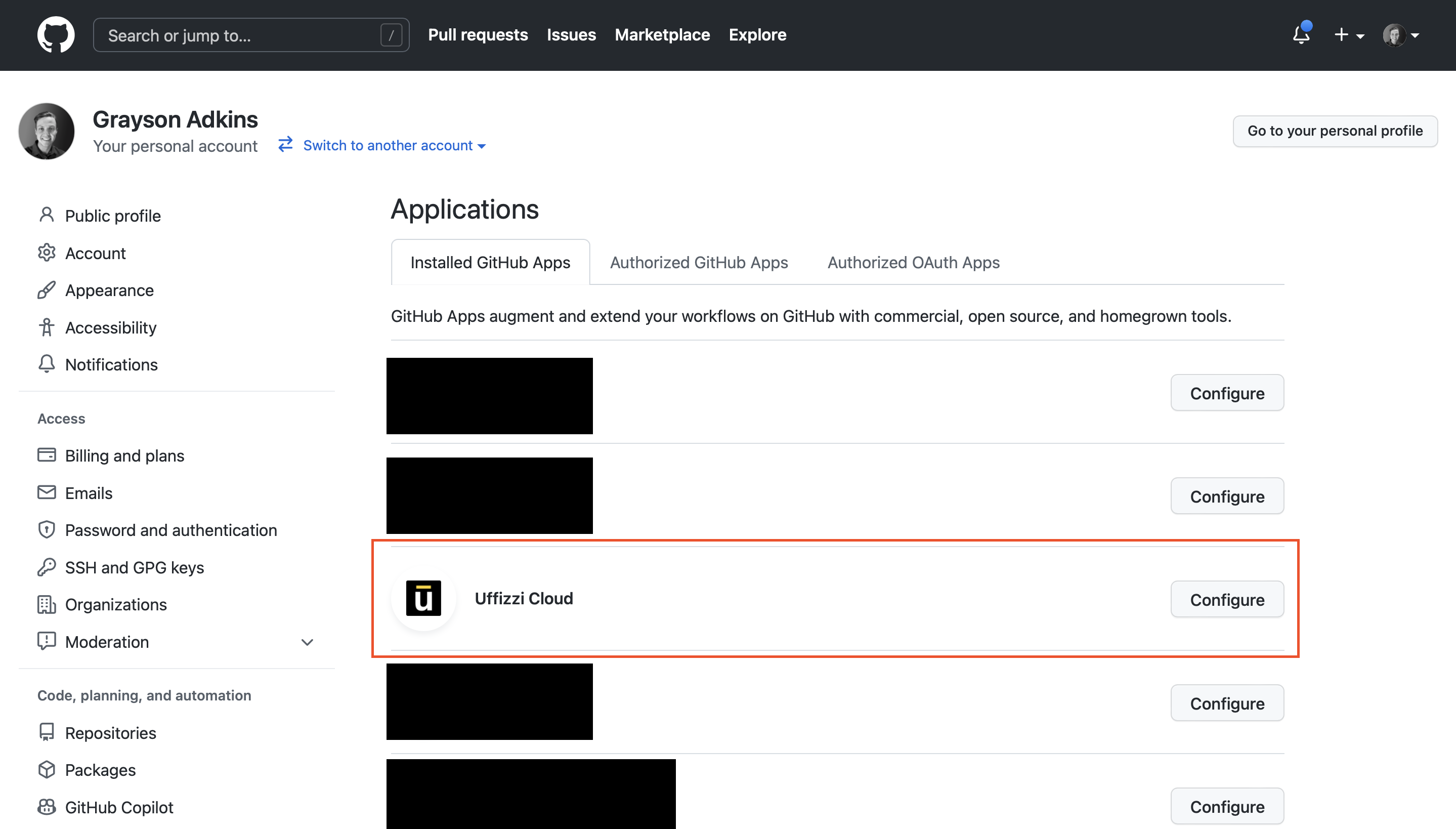 Similarly, you can manage the Uffizzi app installation from GitHub by navigating to Settings > Applications > Uffizzi Cloud > Configure