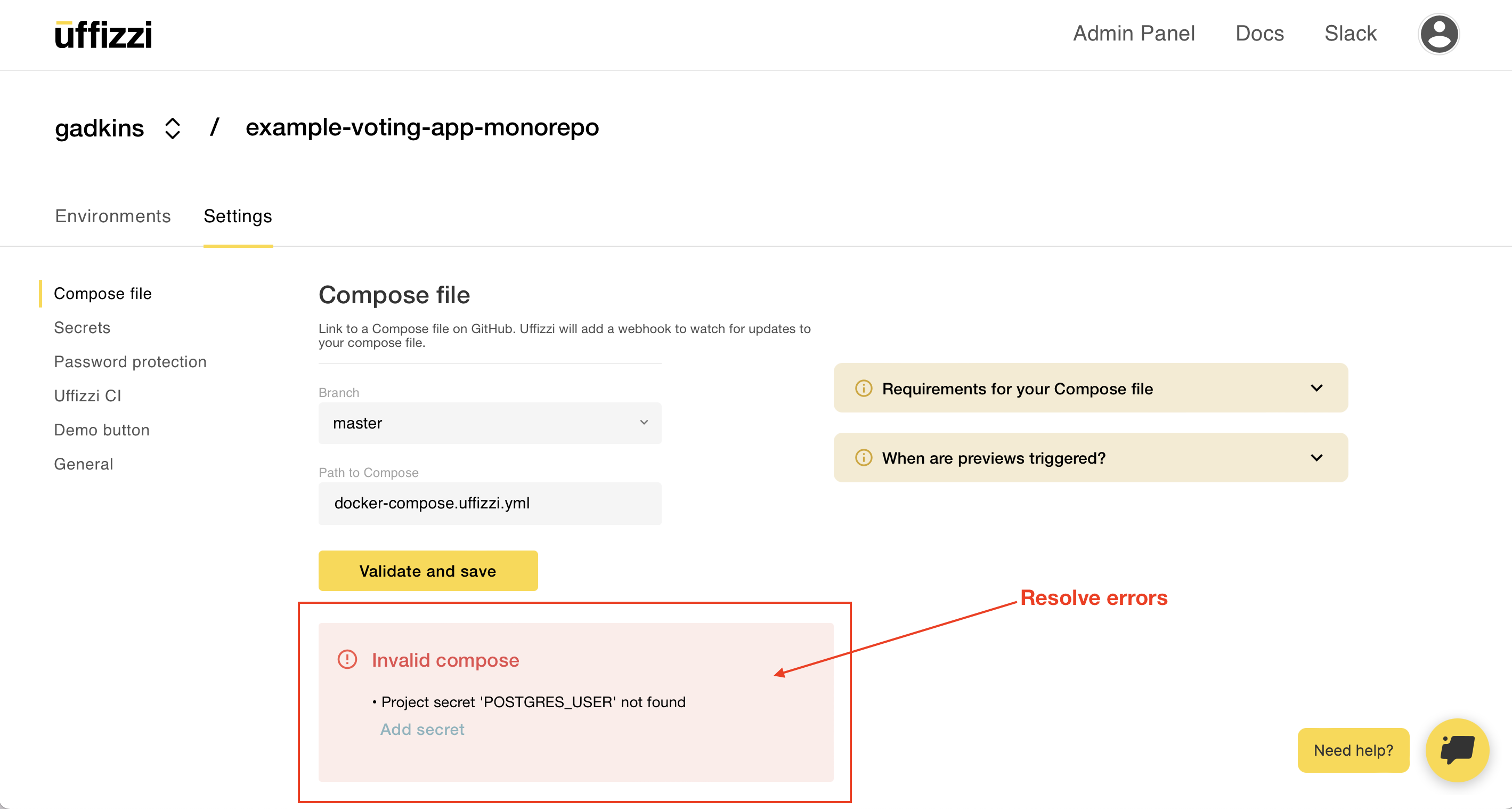 Note, if you did not add your secrets as described in the previous step, you will see a validation error with a link to add your secretes.