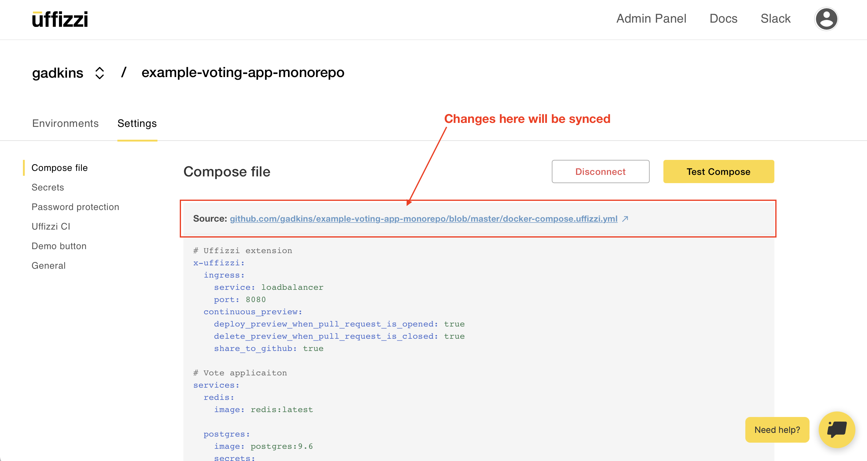 That's it! Uffizzi is now configured with your Docker Compose template. To test your setup, you can manually deploy your primary branch to an on-demand test environment using the Test Compose button in the Uffizzi Dashboard, or try opening a pull request on GitHub to deploy a feature branch.