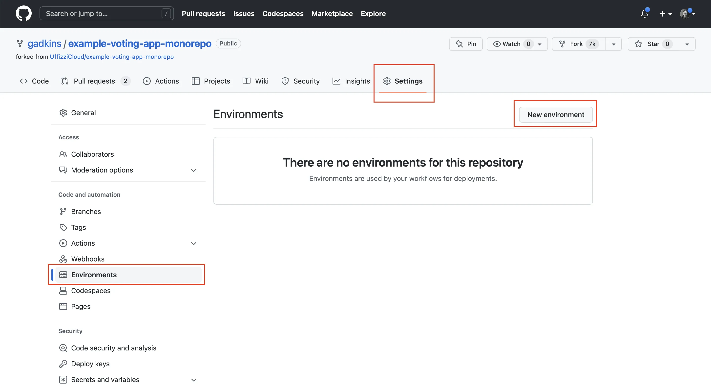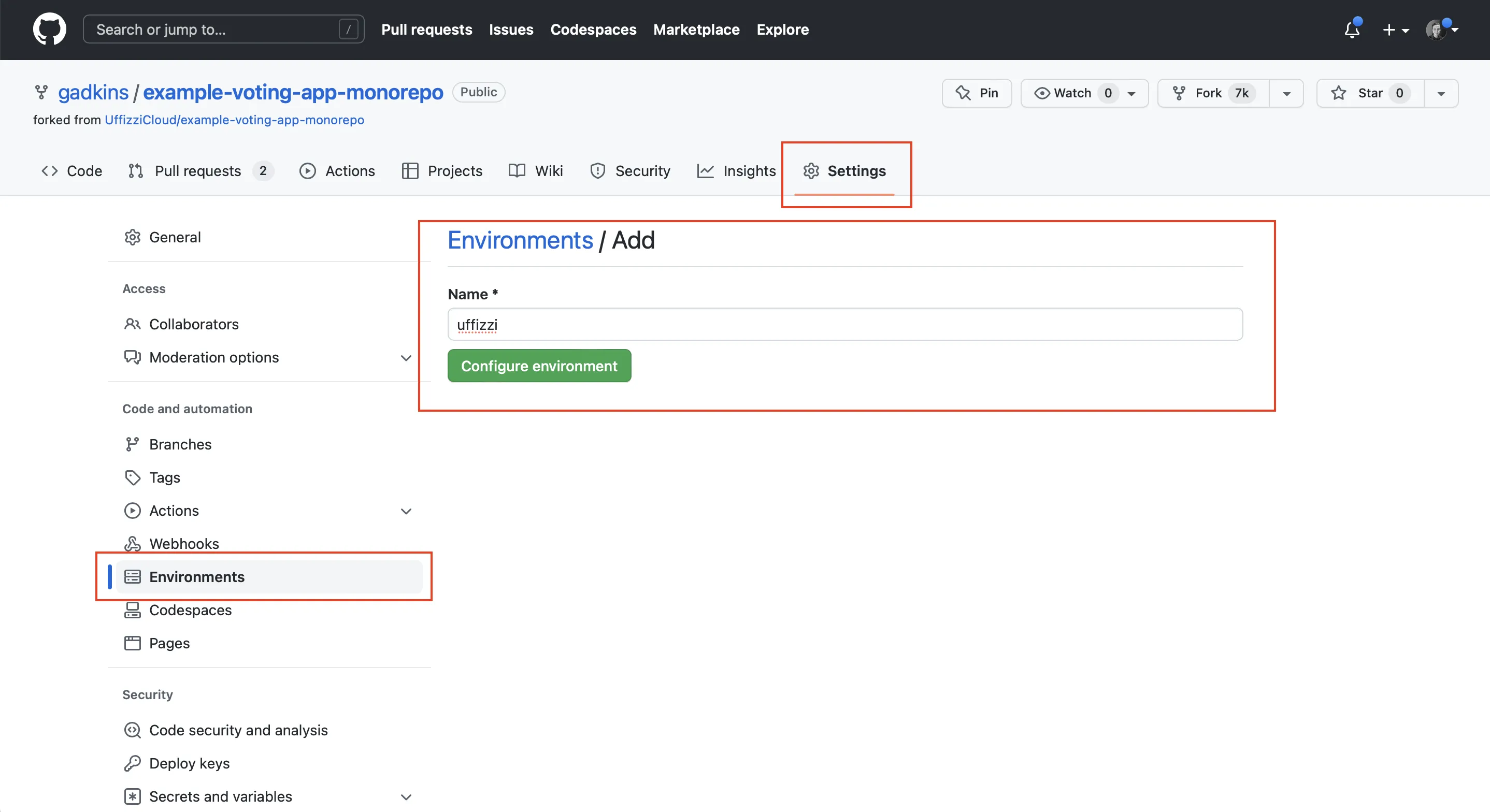 Login to GitHub, then navigate to your repository Settings > Environments and select New environment. For the Environmnet name enter "uffizzi". Note that if you name it something else, it won't work since the reusable workflow expects the enviroment to be named "uffizzi".