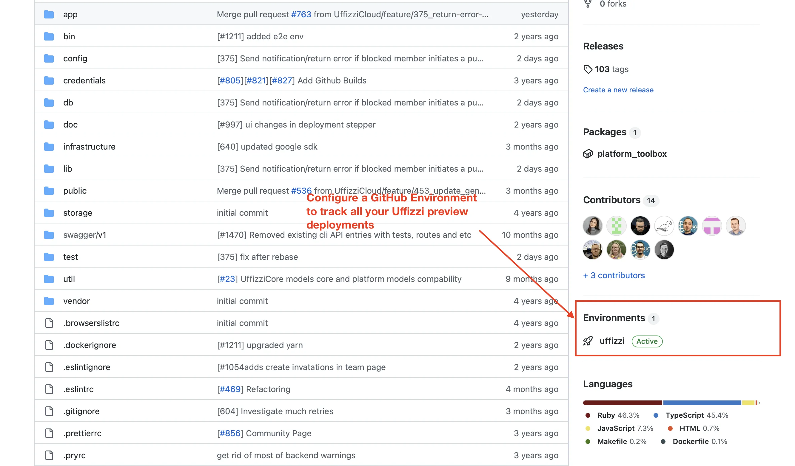 If you're using the standard Uffizzi reusable workflow to create, update, and delete environments on pull request events, then you just need to create a GitHub Environment called "uffizzi" in your reposiory via the GitHub UI. The reusable workflow is pre-configured to populate this Environment with Uffizzi preview deployments. If you're not using the resuable workflow, you'll need to configue the jobs.<job-id>.environment key as described here.