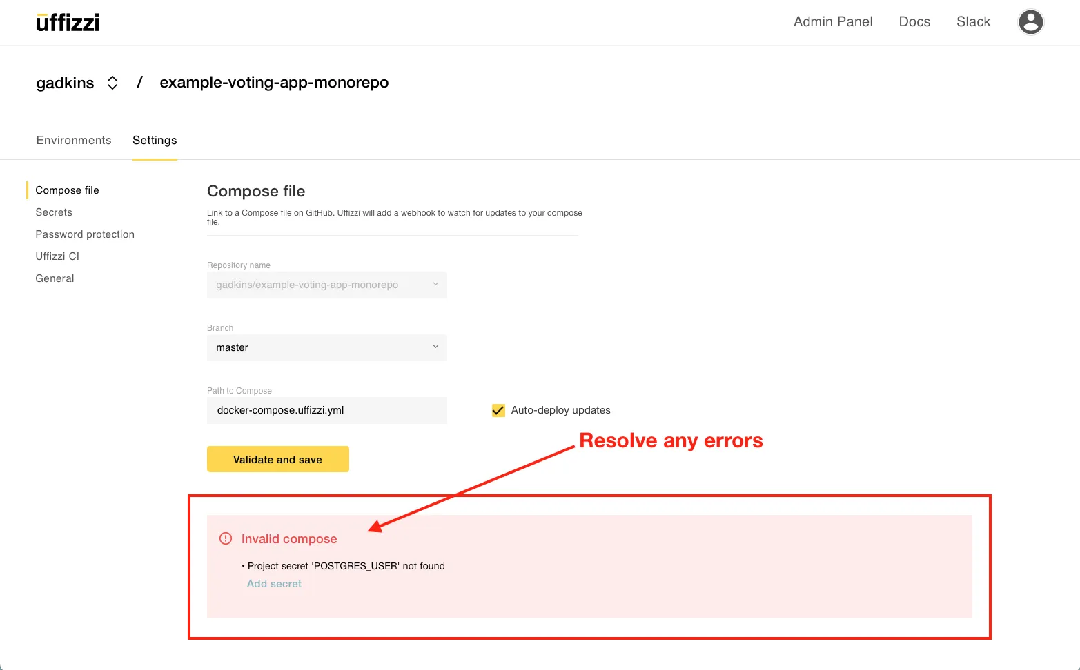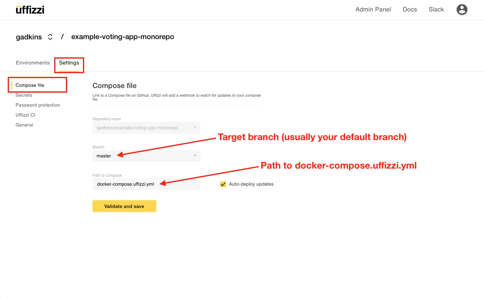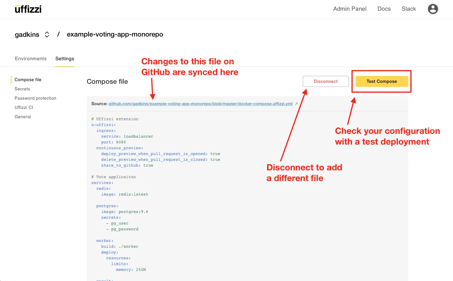 docker-compose.uffizzi.ymlfile in Project > Settings > Compose. Be sure to choose the branch that you merge into, i.e. your target base branch. - Save and validate your compose; resolve any errors