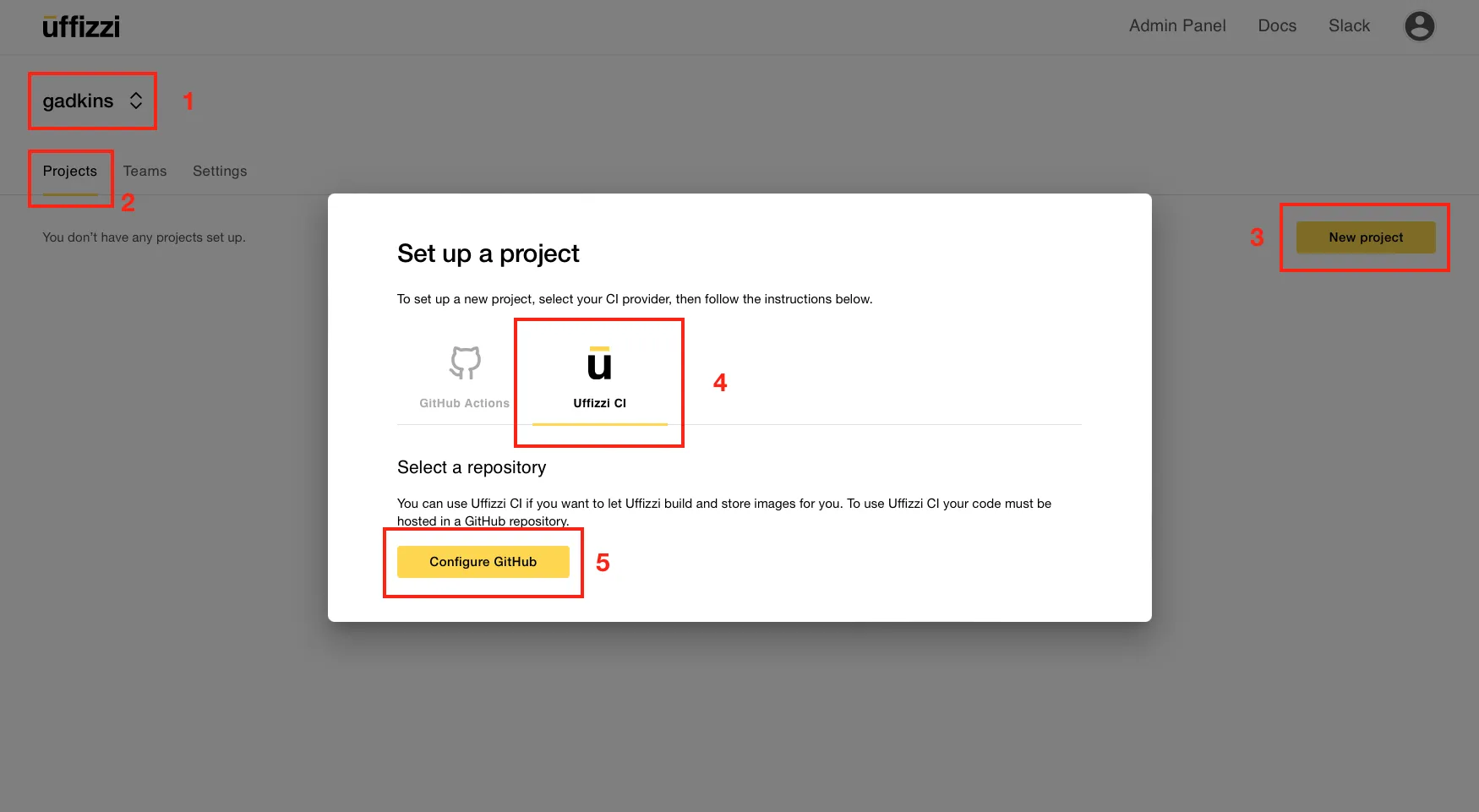 1. Select New project > Uffizzi CI > Configure GitHub