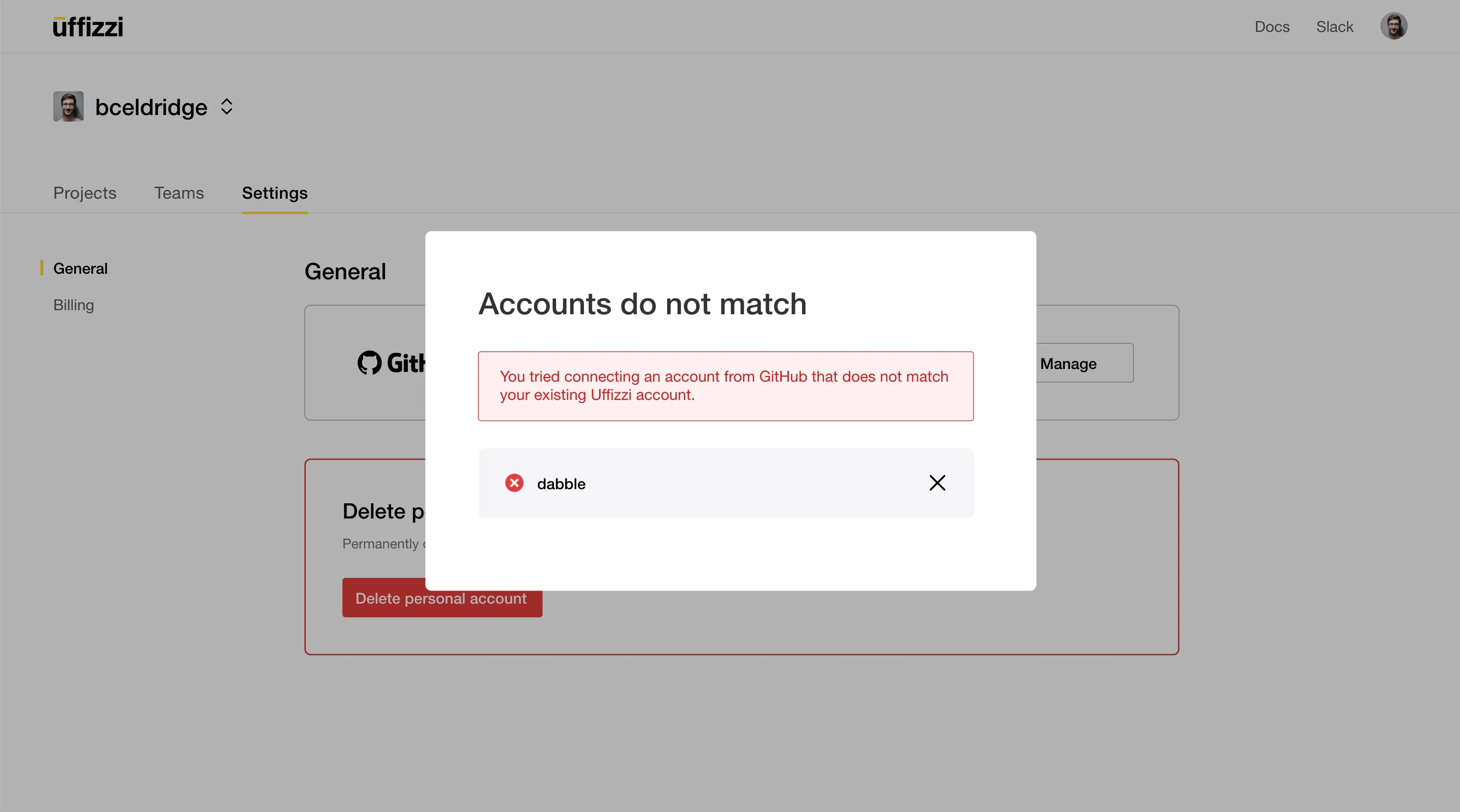 You cannot attach GitHub Organization or GitLab Group credentials to a Uffizzi personal account. You must first create a Uffizzi Team for your GitHub Organization or GitLab Group, then configure credentials. Otherwise, you will see the error below.