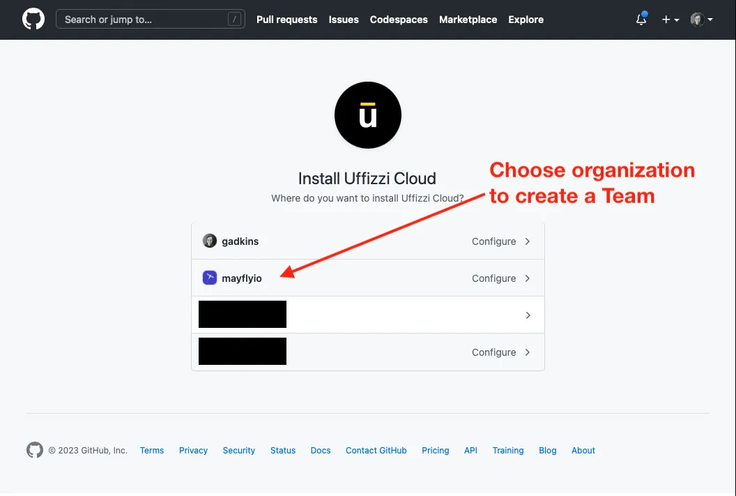 Choose an Organization to create a Team. If you choose a personal account in this step you will get an error in Uffizzi.