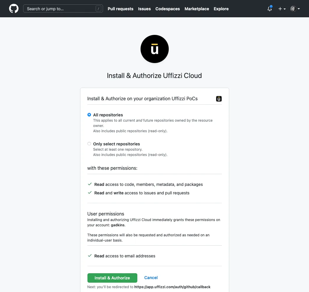 Select the repositories you want to configure with Uffizzi.